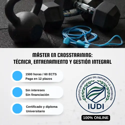 El máster CrossTraining ha revolucionado el mundo del entrenamiento funcional, combinando fuerza, resistencia, potencia, agilidad y trabajo mental para obtener el máximo rendimiento. Este máster universitario 100% online está diseñado para aquellos que deseen convertirse en expertos en técnica, programación, gestión y liderazgo de boxes y centros de CrossTraining. Te permite estudiar a tu ritmo, comenzando y terminando cuando quieras. El título es universitario, emitido por una universidad y se puede pagar en plazos sin intereses.